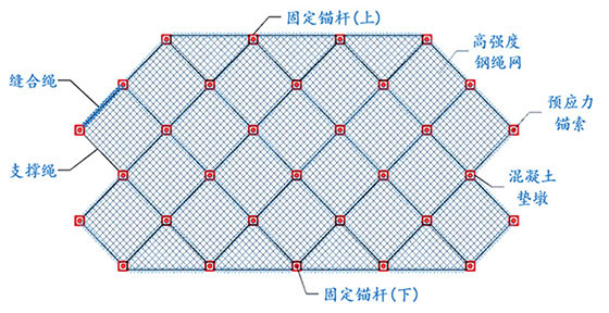 该技术采用锚墩式锚索和主动防护网相结合的形式,创新性地对锚-网接触处进行处理,使二者受力与变形相协调,充分发挥主动与被动锚-网结构的组合效应,形成安全可靠的联合支挡结构,实现对破碎岩质边坡深层与浅表层的“一站式”综合防护。该产品采用锚索和防护网可对边坡深层与浅层协同支护,通过解开缝合绳将防护单元网快速分离更换。目前,该核心技术已顺利通过四川省交通运输厅验收,并完成科技成果鉴定,获评“整体达到国际先进水平,建议进一步推广应用”。此外,该技术成功入选交通运输部《交通运输行业节能低碳技术推广目录(2024年度)》,以及由科技部与国家自然科学基金委员会联合编制的《面向“一带一路”国家可持续发展技术清单(2025)》,充分体现了其在行业内的技术先进性与推广价值。