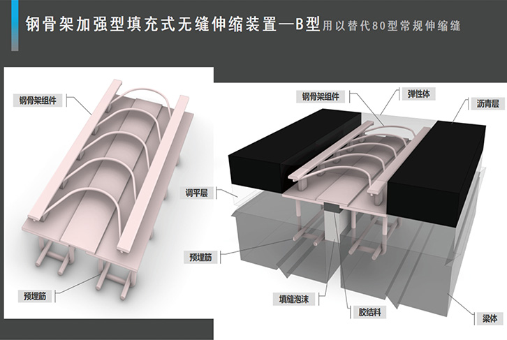 正交异性无缝伸缩装置在对传统填充式弹塑性伸缩缝病害机理深入分析研究基础上进行了重要技术改进,创新采用型钢骨架与新弹塑性填充体材料,有效提升了无缝伸缩装置的力学性能和无缝桥梁的抗震性能,简化了施工和养护过程,解决了传统填充式伸缩缝易脱粘、不稳定等问题,改善了驾票舒适度,减少了桥梁结构的次生病害,全桥无缝率达100%。该产品可广泛适用于单孔跨径不超过100m的所有桥梁,其良好的缓冲和消能作用可用于高烈度地区的中小跨径常规桥梁。试验桥已平稳运行8年整,无病害现象,在正常养护条件下,预计寿命可达15年以上。