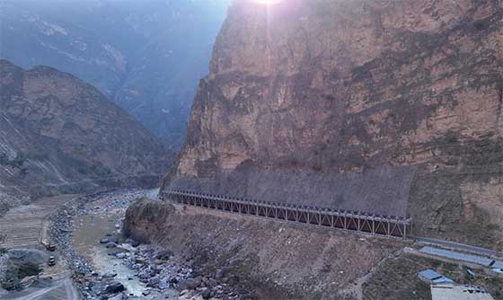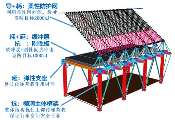 装配式钢棚洞聚焦应急救援装备配备和物资储备,改善基层应急救援条件,提升基层应急救援保障能力,相较传统钢棚洞创新采用分级分层防护理念,结构形式分为上、中、下三部分组合结构,合理应用材料“导、延、耗、抗”特性,可根据地质灾害能级大小,对结构各构件进行选配以满足设防标准。装配式结构实现了标准化、工厂化制作,现场施工快速。所有构件均采用螺栓、销轴进行连接,满足施工条件下,一节段(6m)装配时间仅3~4小 时,极大程度降低施工风险。可作为永久结构对山区公路高位崩塌地质灾害点进行处置和临时结构在灾害发生后应用于应急抢险保通。通过快速部署应急防护棚洞,可在灾害发生后迅速构建临时防护体系,显著缩短道路中断时间,有效抵御落石冲击,保障通行安全,便于救援力量如救援队伍、救援车辆及物资快速到达救援现场,降低二次灾害风险。