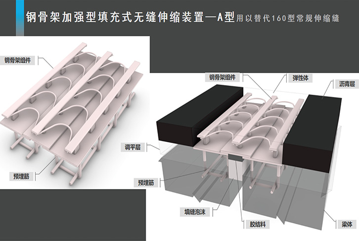 正交异性无缝伸缩装置在对传统填充式弹塑性伸缩缝病害机理深入分析研究基础上进行了重要技术改进,创新采用型钢骨架与新弹塑性填充体材料,有效提升了无缝伸缩装置的力学性能和无缝桥梁的抗震性能,简化了施工和养护过程,解决了传统填充式伸缩缝易脱粘、不稳定等问题,改善了驾票舒适度,减少了桥梁结构的次生病害,全桥无缝率达100%。该产品可广泛适用于单孔跨径不超过100m的所有桥梁,其良好的缓冲和消能作用可用于高烈度地区的中小跨径常规桥梁。试验桥已平稳运行8年整,无病害现象,在正常养护条件下,预计寿命可达15年以上。